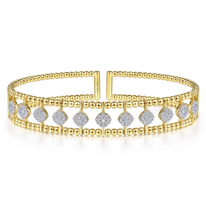 Gorgeous yellow gold bangle accented by multiple clusters of diamonds.