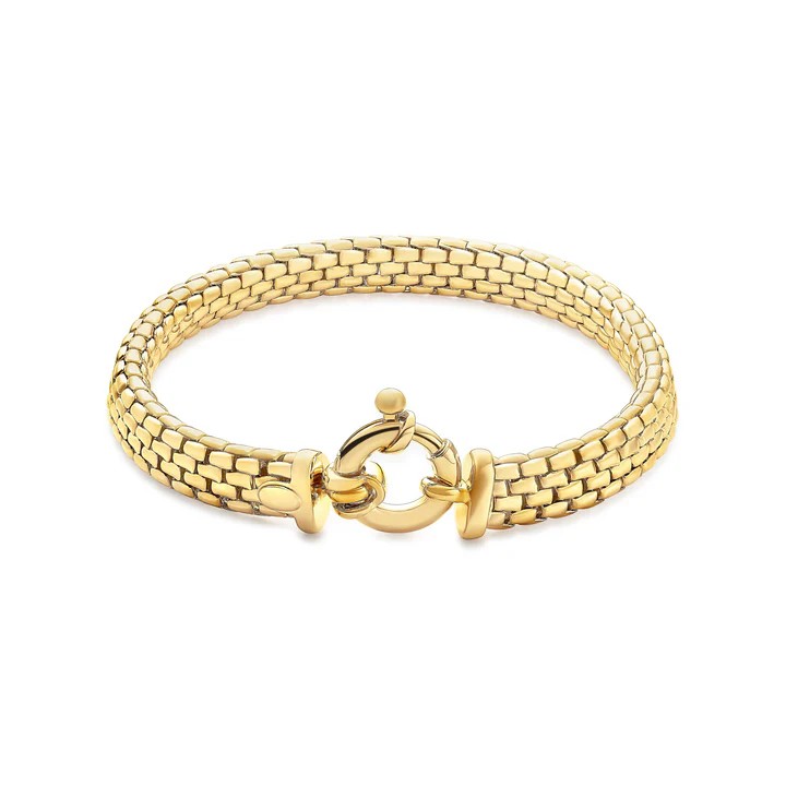 This stunning piece features interlocking links that create a liquid gold effect, guaranteed to turn heads.