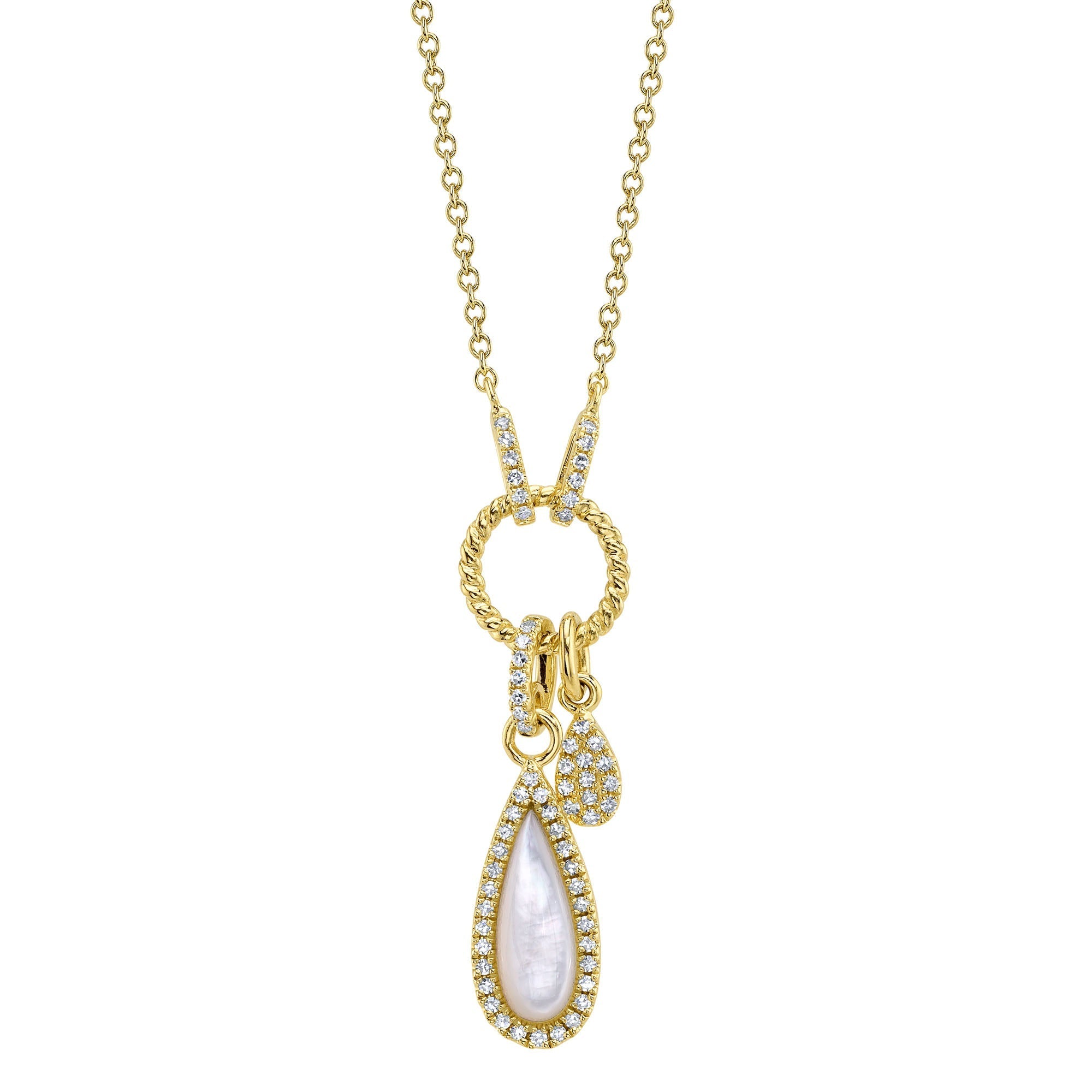 This captivating piece features a luminous Mother of Pearl drop embraced by a halo of sparkling diamonds, suspended from a shimmering 14K yellow gold chain.