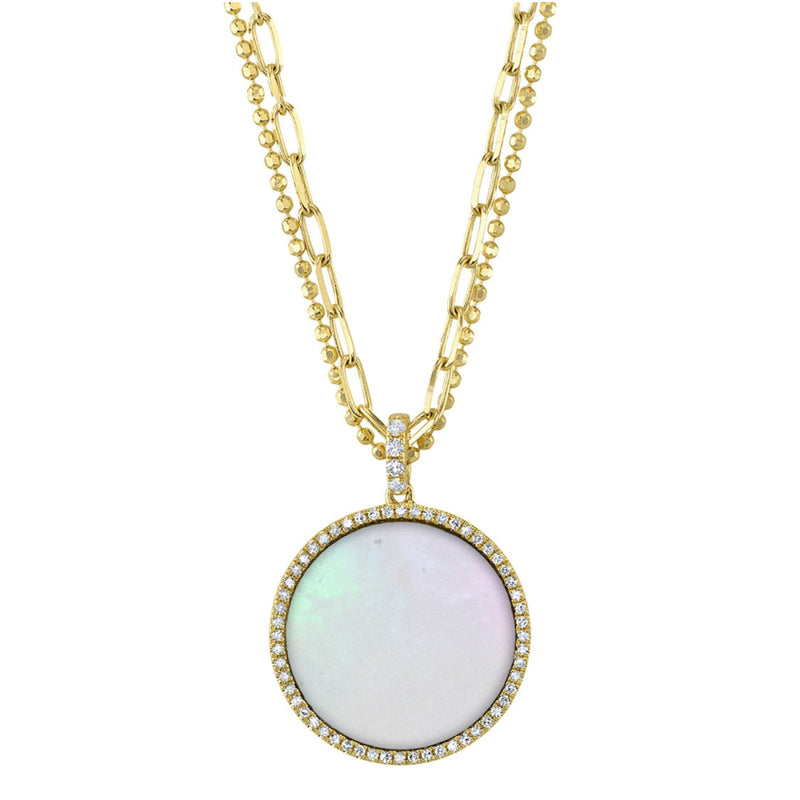 This exquisite piece features a lustrous 2.77CT mother of pearl disc, framed by a dazzling halo of .20CTW diamonds, all set in gleaming 14K yellow gold.