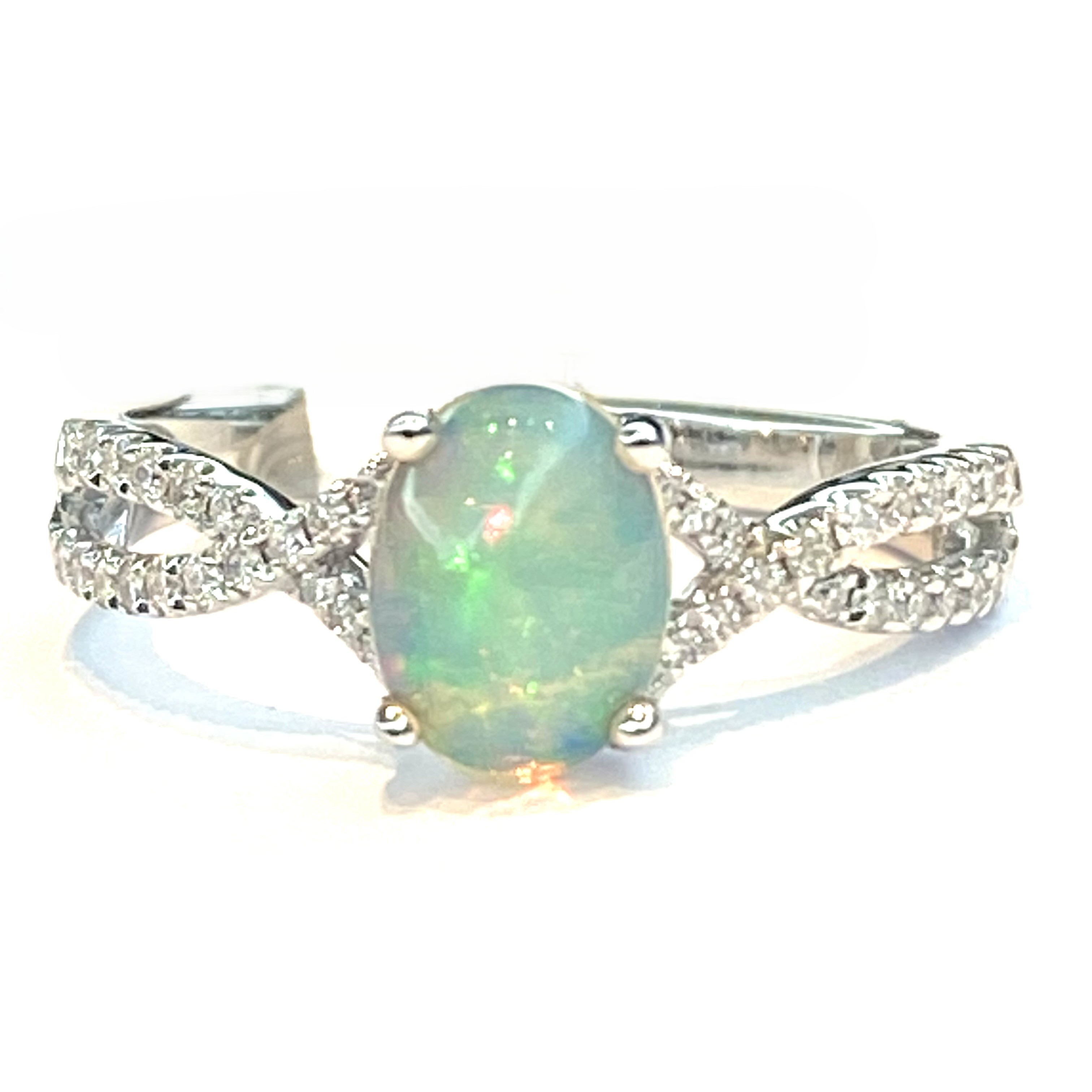10K WHITE GOLD OVAL OPAL AND DIAMOND TWIST RING