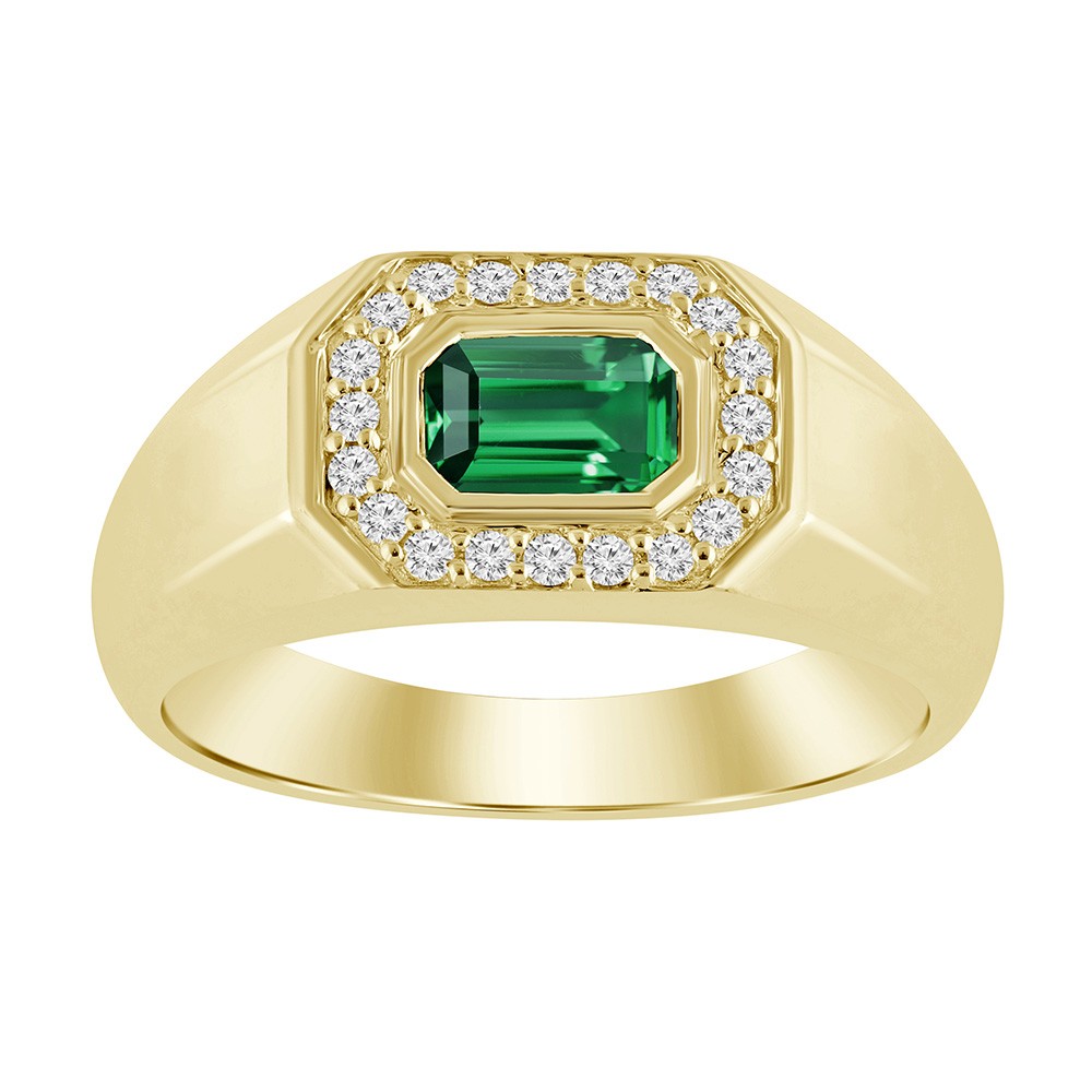 This isn't just a ring, it's a statement. Set in radiant 18KY gold, a stunning .60ct emerald radiates confidence, surrounded by a halo of sparkling diamonds (.14ctw).