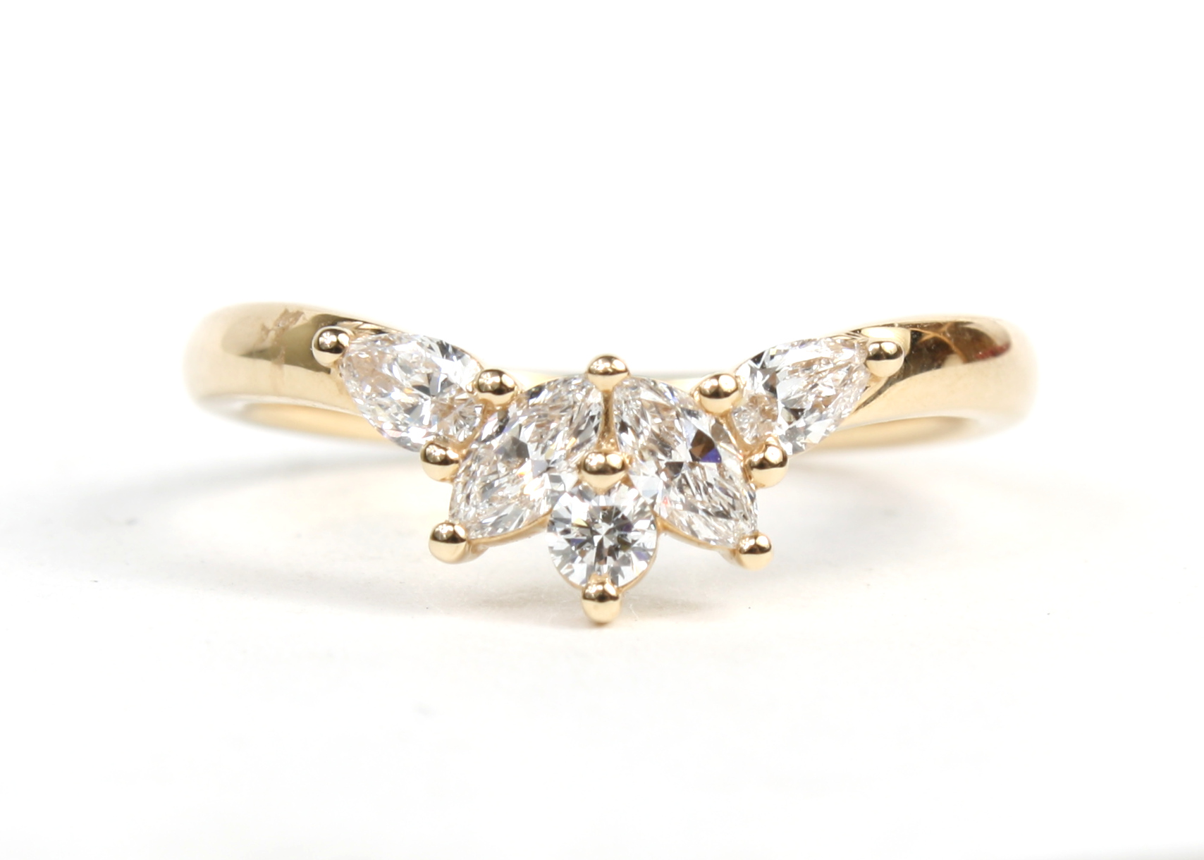 The unique design features marquise, pear, and a round cut diamond, creating a stunning sparkle. Perfect as a statement piece or stacked with your favorites, this band will elevate any look!